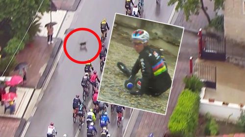 Giro d'italia - un cane attraversa la strada e vanno giù i quick step: a terra anche remco evenepoel